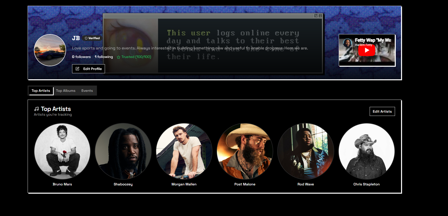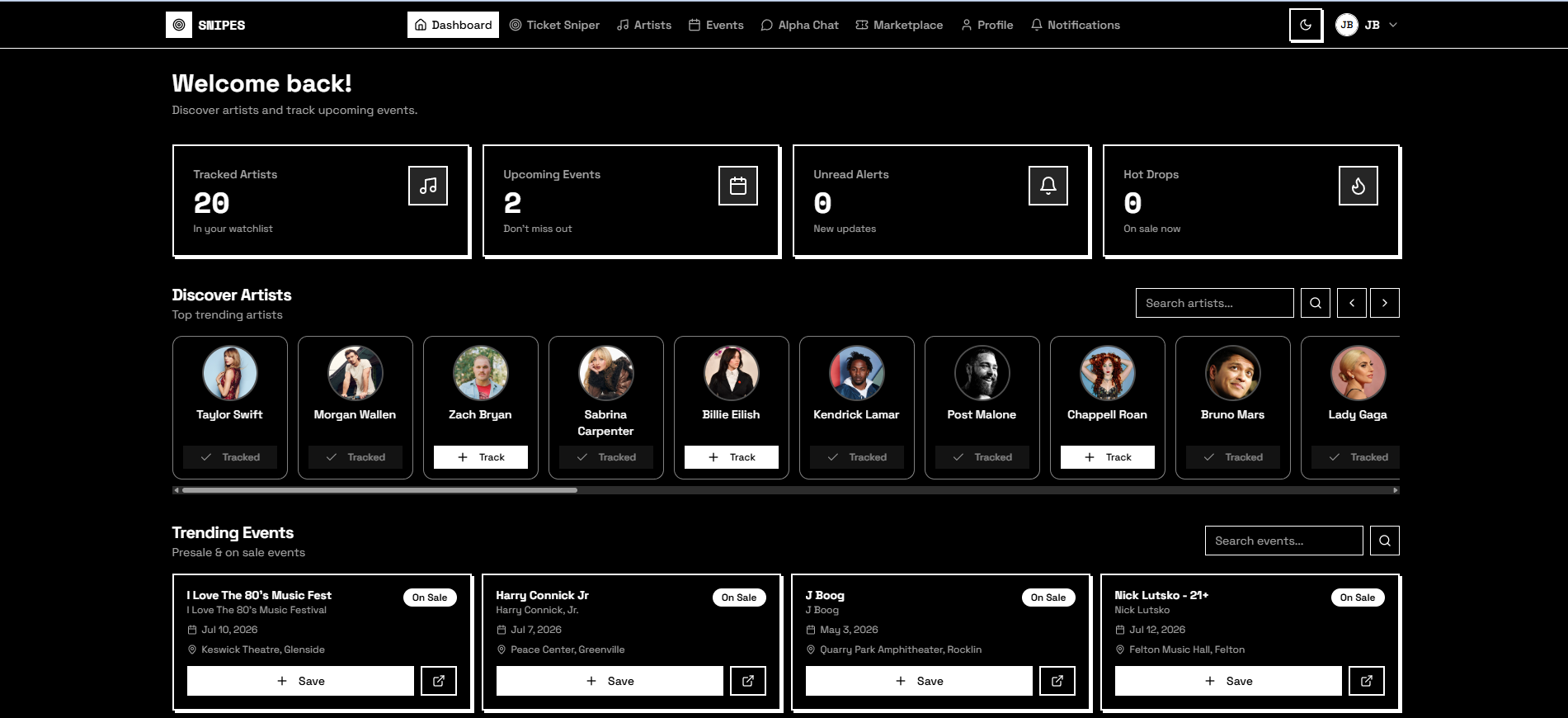 We built an all-in-one platform that pulls live concert data (presales, resell inventory, upcoming tours) from Bandsintown, Ticketmaster, and other real-time APIs. On top of the data layer we built a full social platform: user profiles with custom music, friends, real-time chat, a peer-to-peer marketplace with a trust factor system, and artist tracking with push notifications.