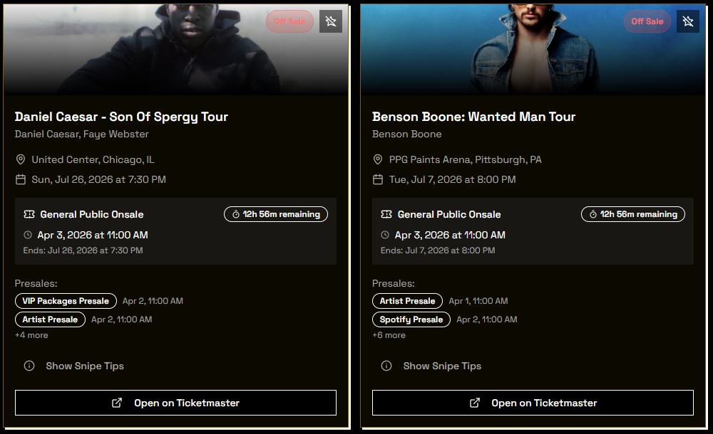 Real-time aggregation of presales, resell inventory, and upcoming tours from Bandsintown, Ticketmaster, and more.